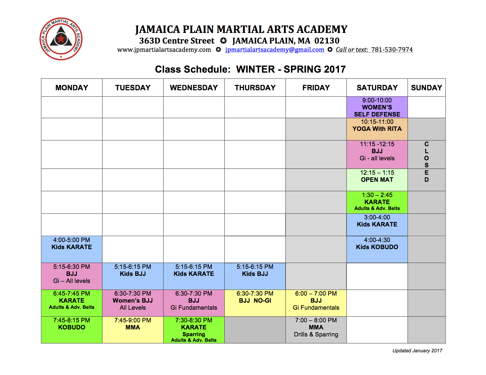 NEWS + UPDATES New Class Schedule for Winter/Spring 2017 January 3, 2017 jpmartialartsacademy Click Image to Enlarge Related