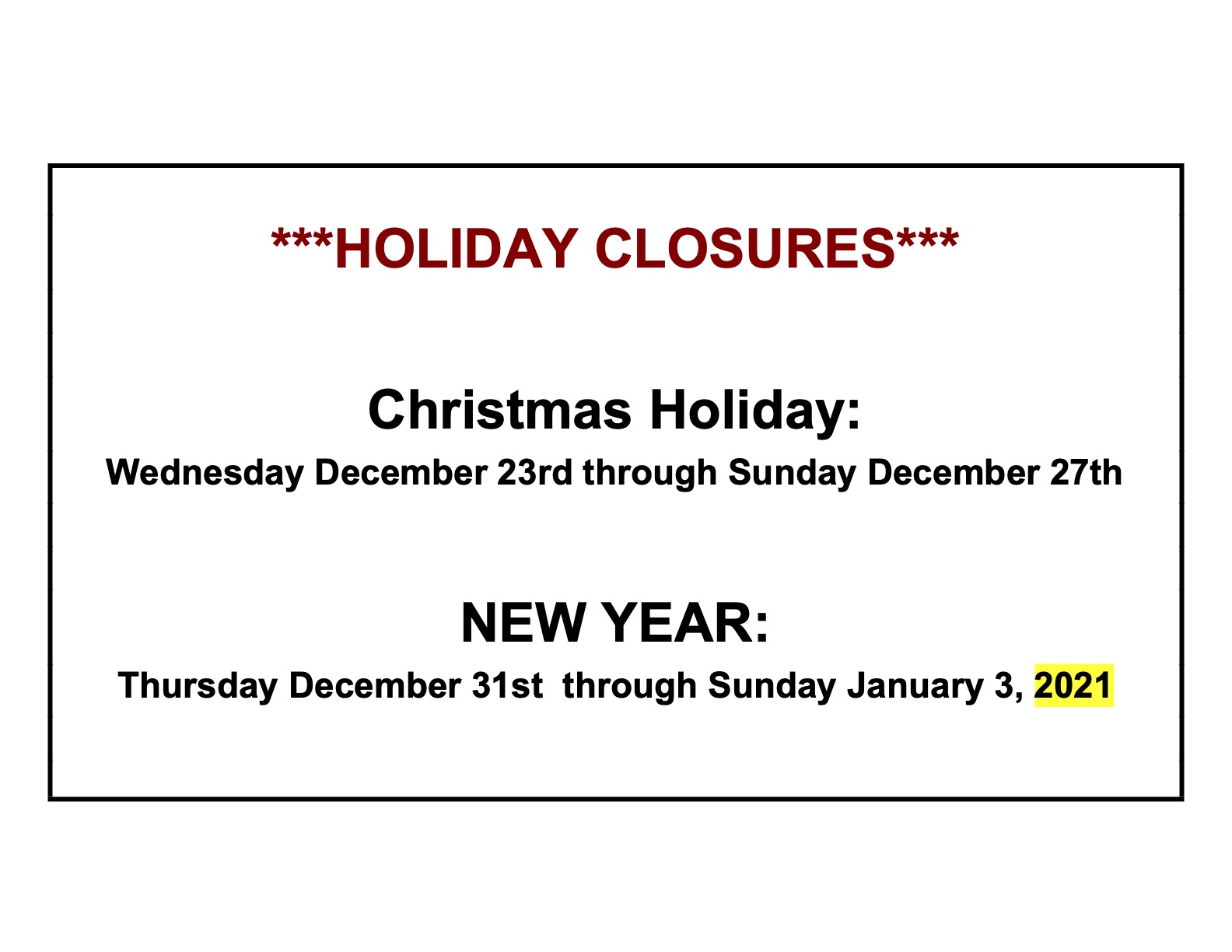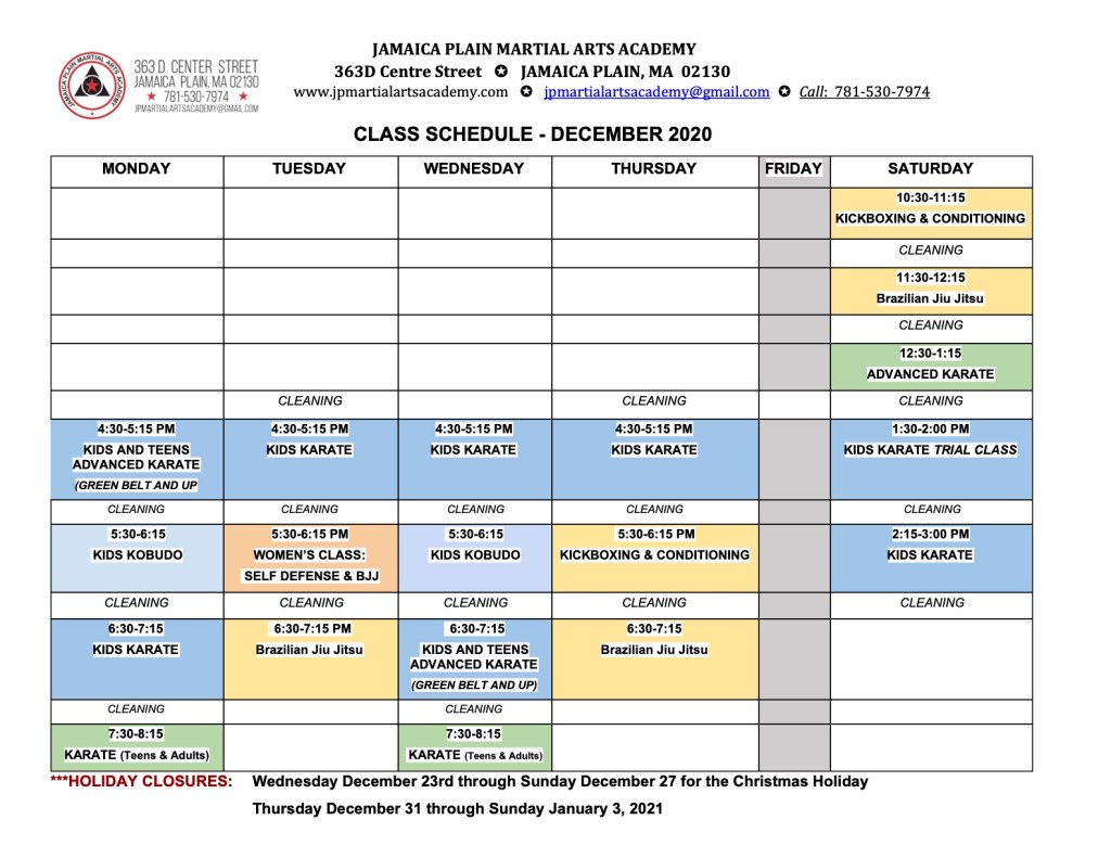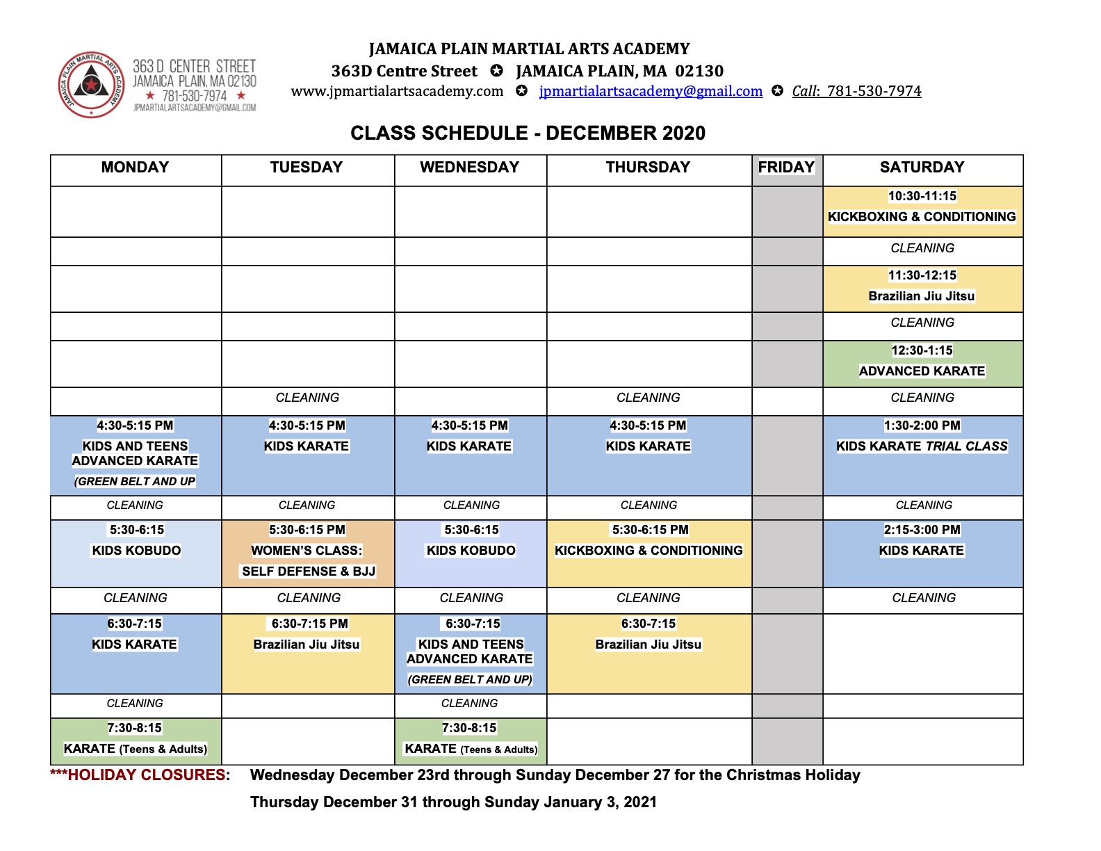 NEWS + UPDATES December Schedule & Holiday Closures December 2, 2020 jpmartialartsacademy Click Images to Enlarge Related