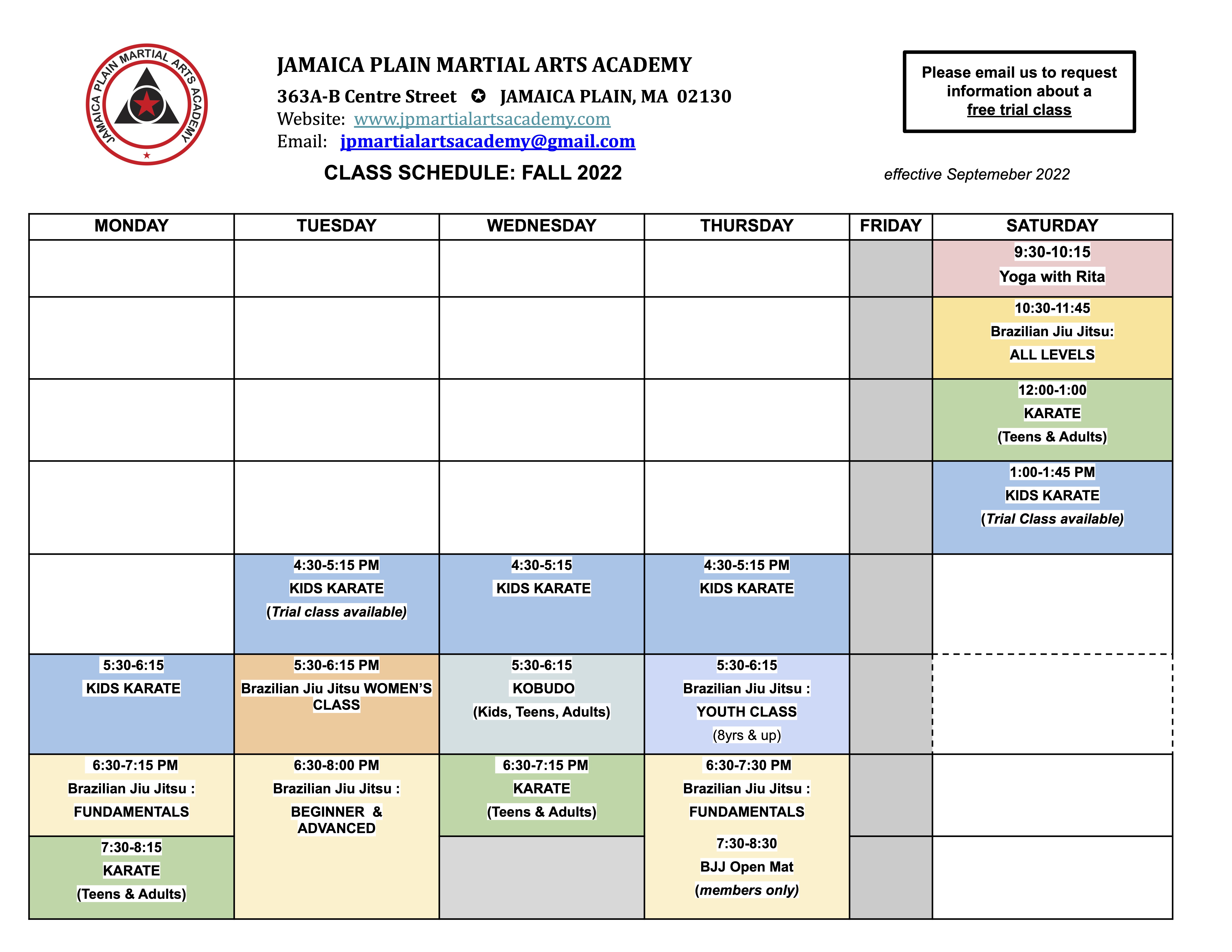 Our Fall schedule of classes can be found below. The schedule takes effect on Sept. 6th!