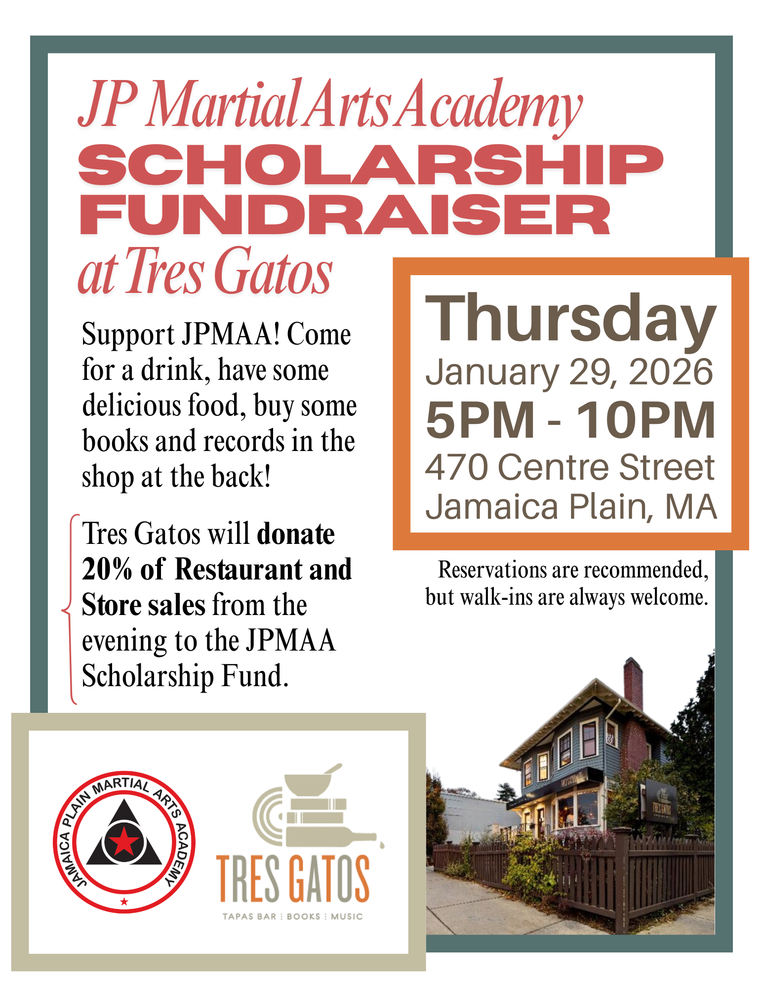 NEWS + UPDATES JPMAA Scholarship Fundraiser at Tres Gatos! January 4, 2026 jpmartialartsacademy Thursday, January 29, 2026 | 5 – 10 PM Tres Gatos | 470 Centre Street, Jamaica Plain, MA 02130 All are welcome! Tres Gatos will donate 20% of Restaurant and Store sales from the evening to JPMAA. Related