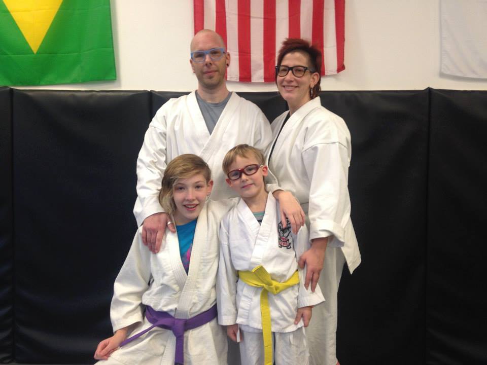 Teagan, age 11, first began training Karate and Brazilian Jiu-Jitsu with Sensei Shim at the West Roxbury YMCA 3 years ago, when she was 8 years old, and now has her Purple Belt in Karate. Calder, age 6, joined JPMAA 7 months ago, and was recently promoted to Yellow Belt in Karate. Karen began training 3 months ago, and Kevin just began one month ago in December.